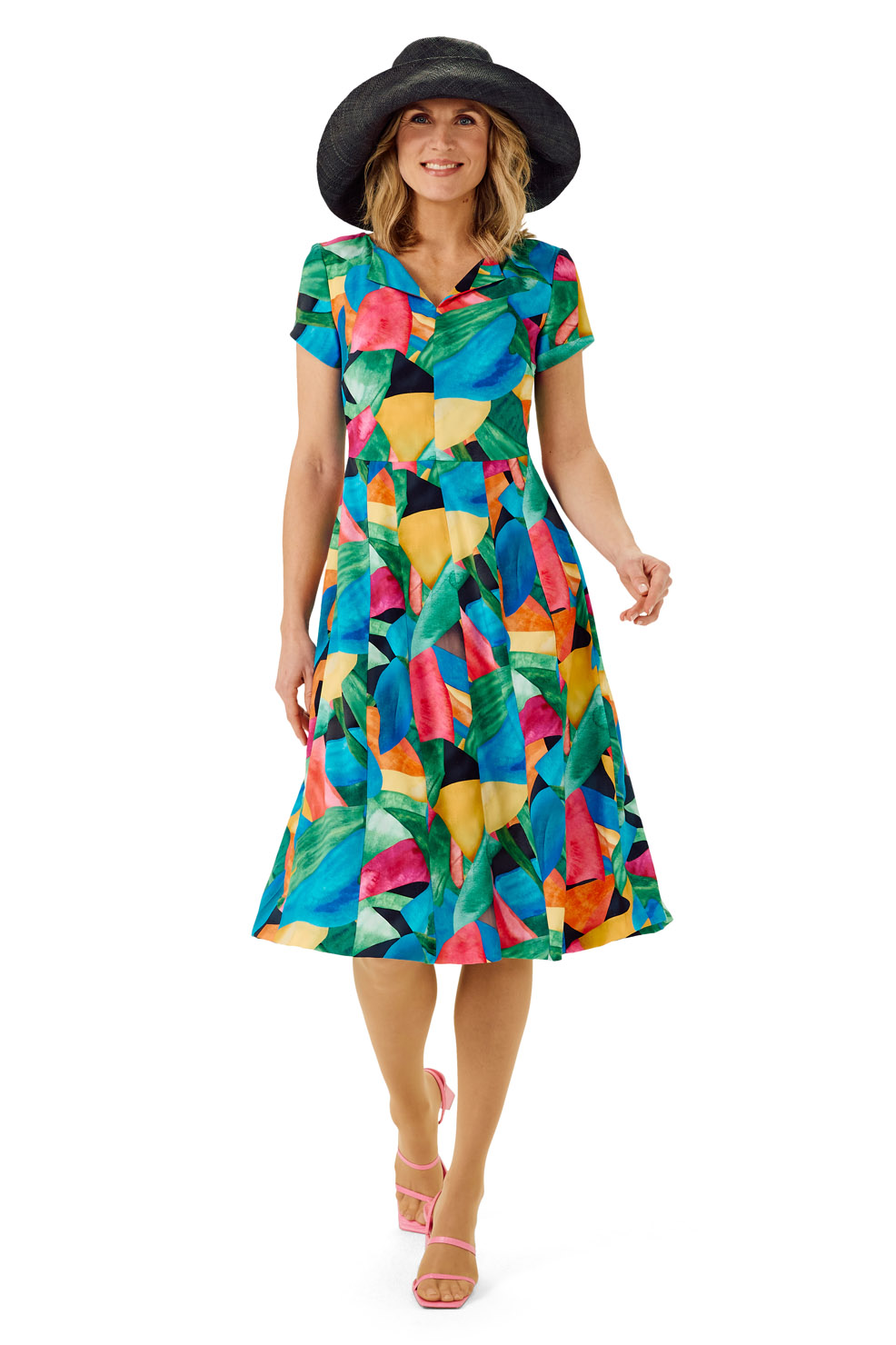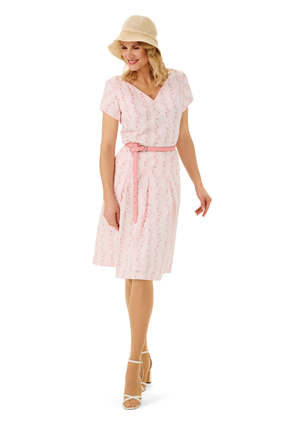 Leicht ausgestelltes Kleid mit eckigem Ausschnitt, Taillenfalte, Bindegürtel und kurzem Ärmel.