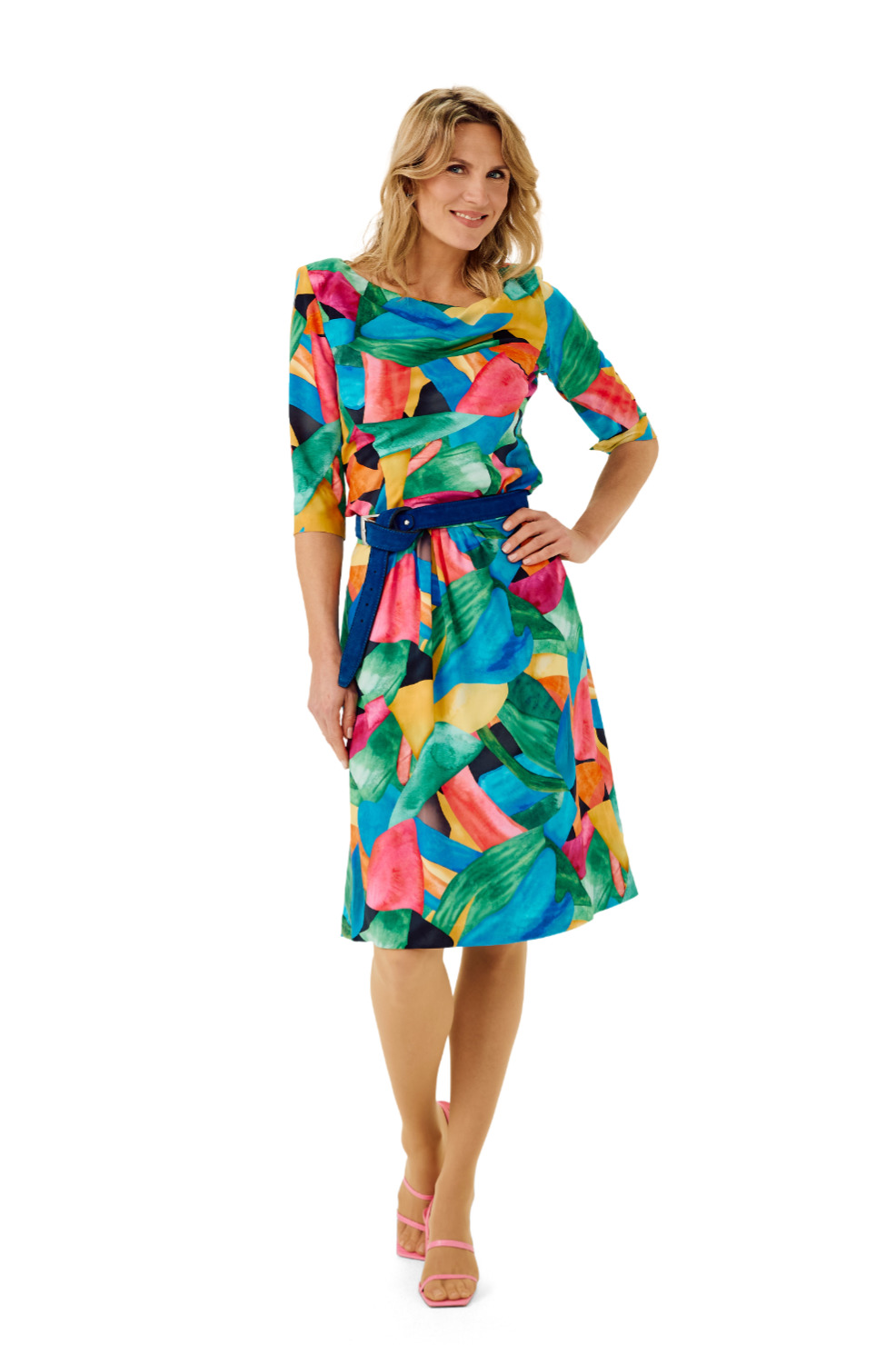 Hochsommerliches Seidenkleid für den kleinen Anlass mit Falten in der Taille, Schmuckgürtel und kurzem Ärmel.