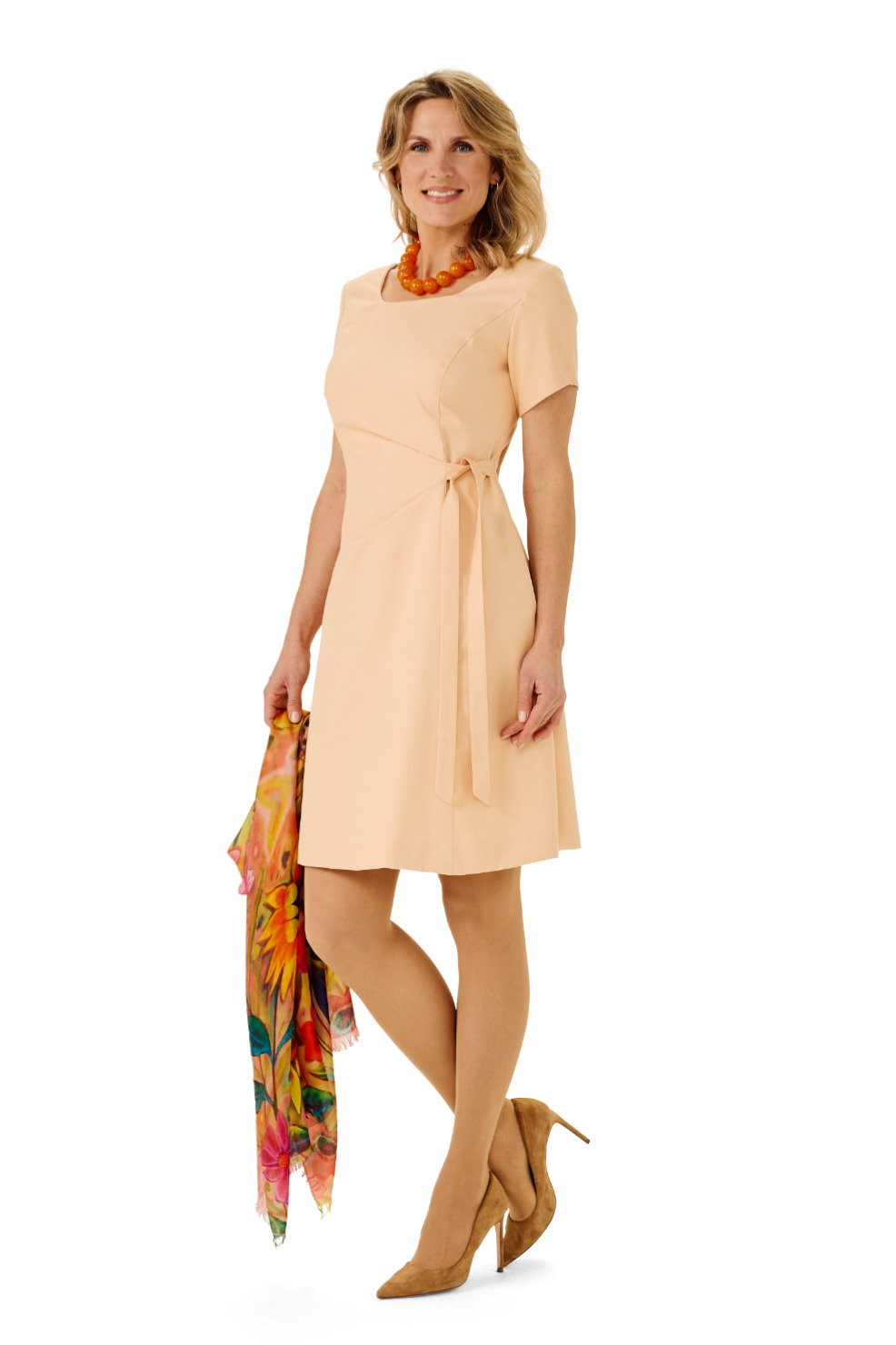 Tageskleid in Mandarin Farben mit seitlich eingelegten Falten, Ziergürtel, Rundhalsausschnitt und kniebedeckender Länge.