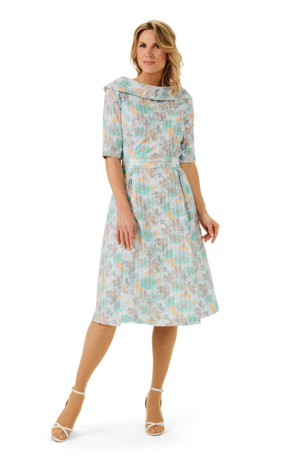 Cocktailkleid mit eckigem Ausschnitt, tief eingelegten Falten, italienischer Länge und schrägem Kurzarm.