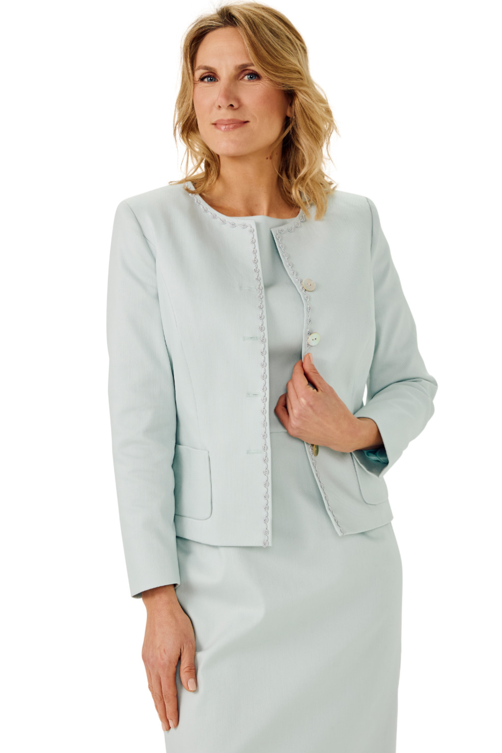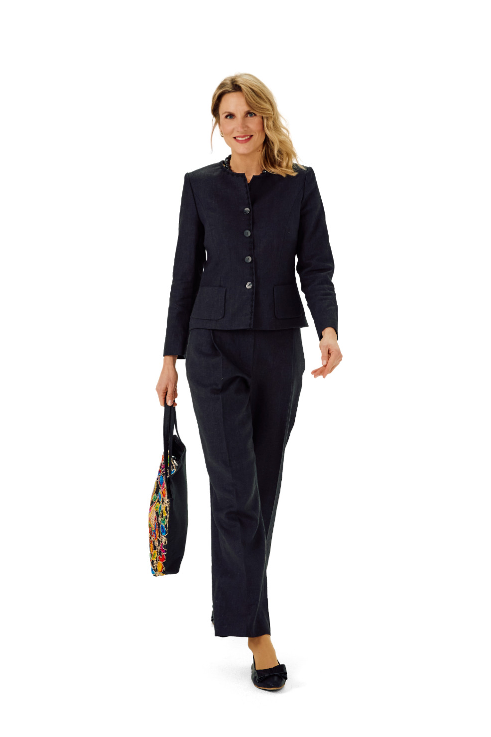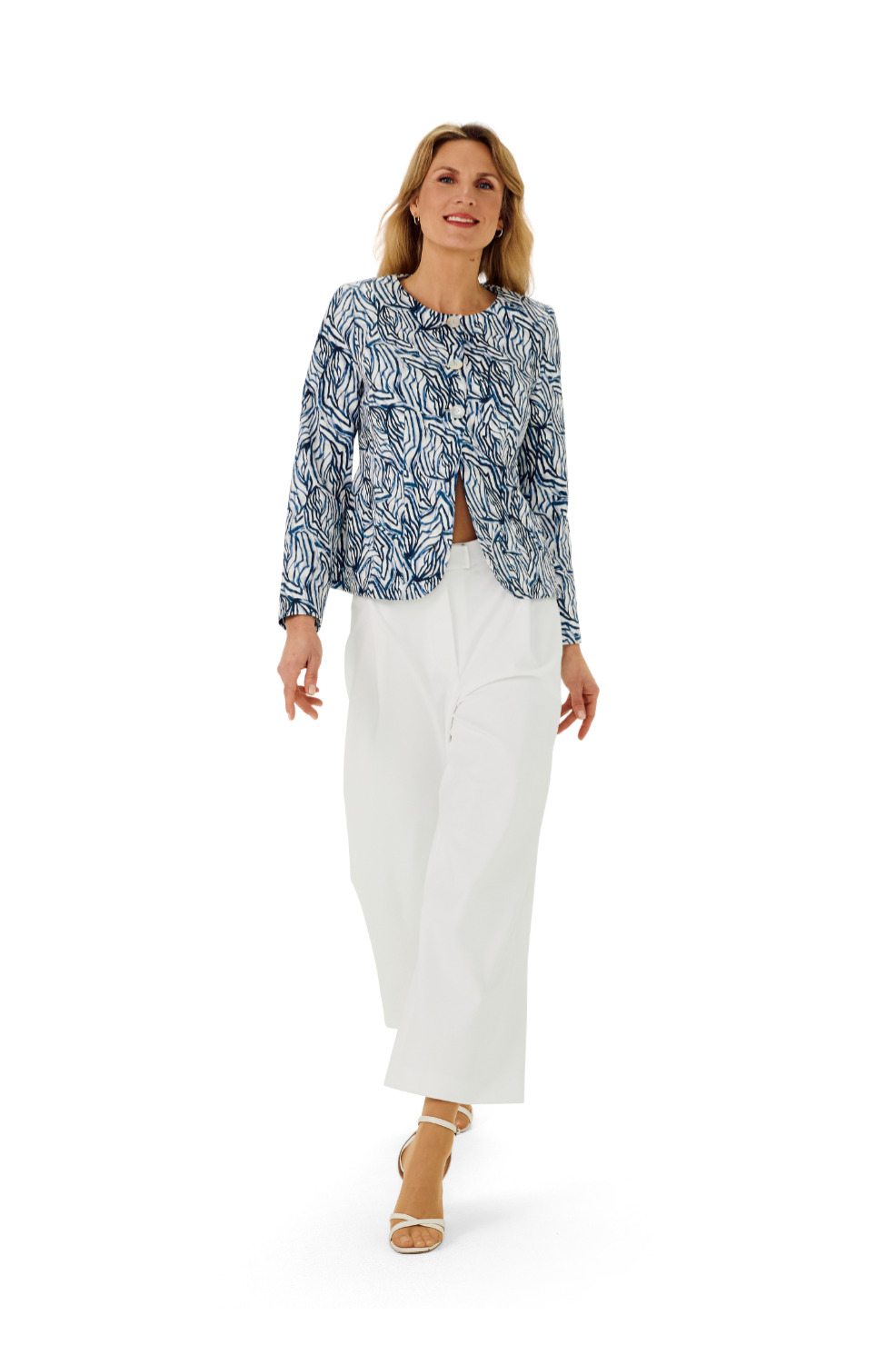 Sportlich-elegante kragenlose Jacke mit abgerundeter Saumkante, kombiniert mit weißer Hose aus Romanit.