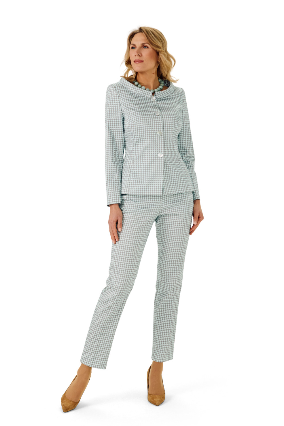 Hosenanzug aus türkis-grauem Hahnentritt mit schmaler Jacke und passender eleganter Hose.