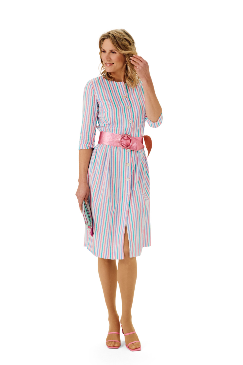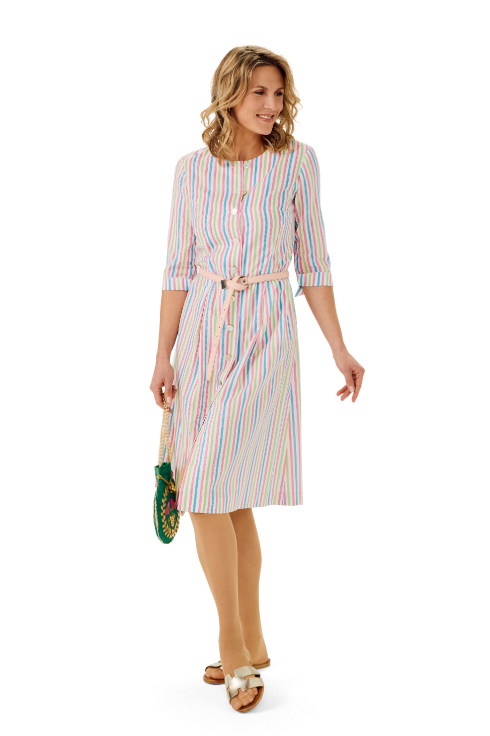 Gestreiftes Baumwollkleid mit Taillenfalten, durchgehender Knopfleiste, Dreiviertelarm und kniebedeckender Länge.
