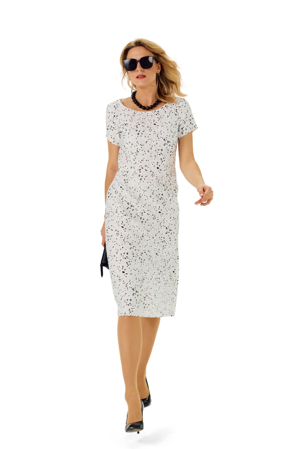 Leichtes Sommerkleid mit schwarzem Kreis-Dessin, Taillentrennung, feinen Falten und kniebedeckender Länge.