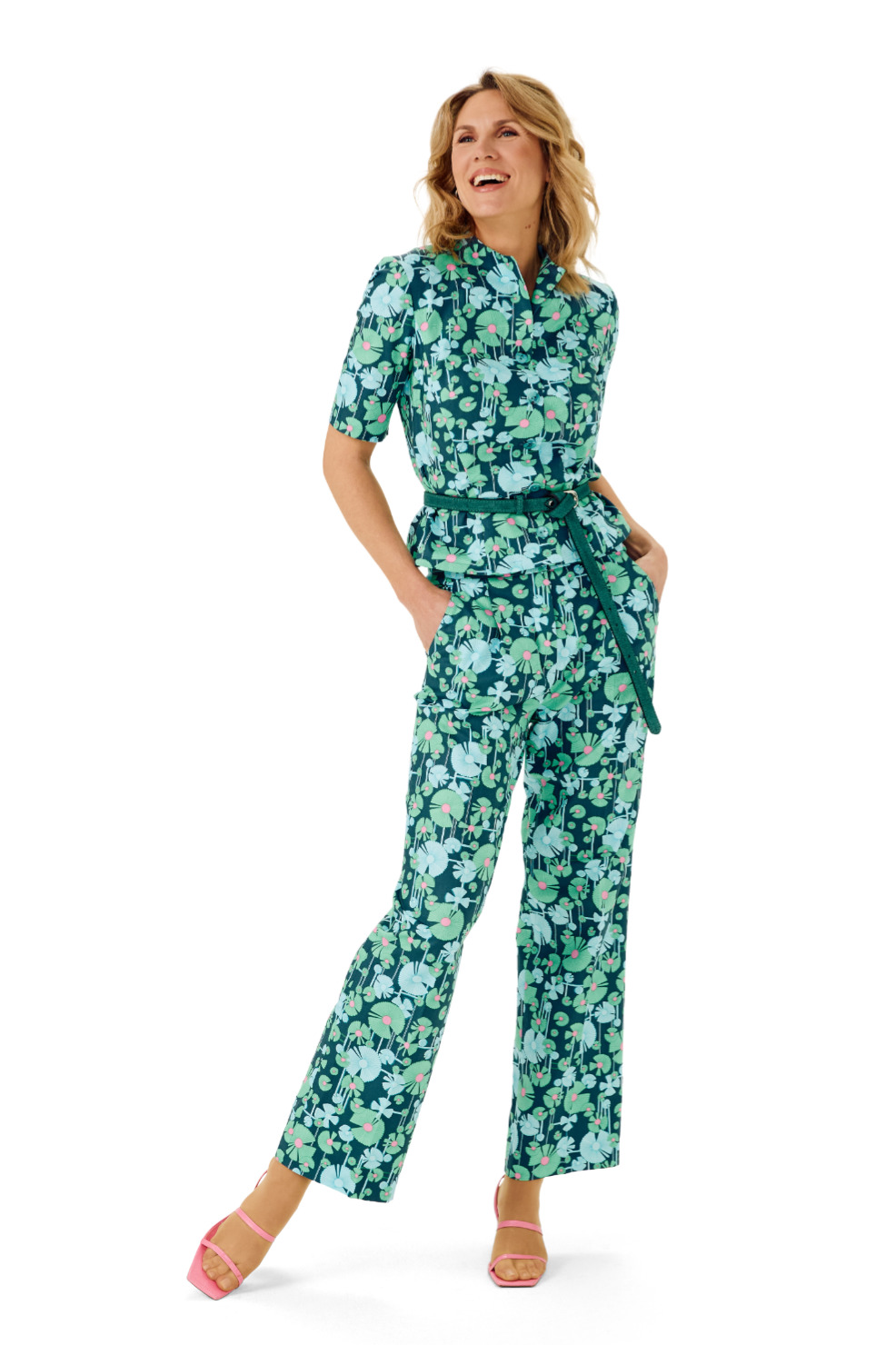 Bunter zweiteiliger Hosenanzug aus englischer Baumwolle mit ausdrucksstarkem Muster.