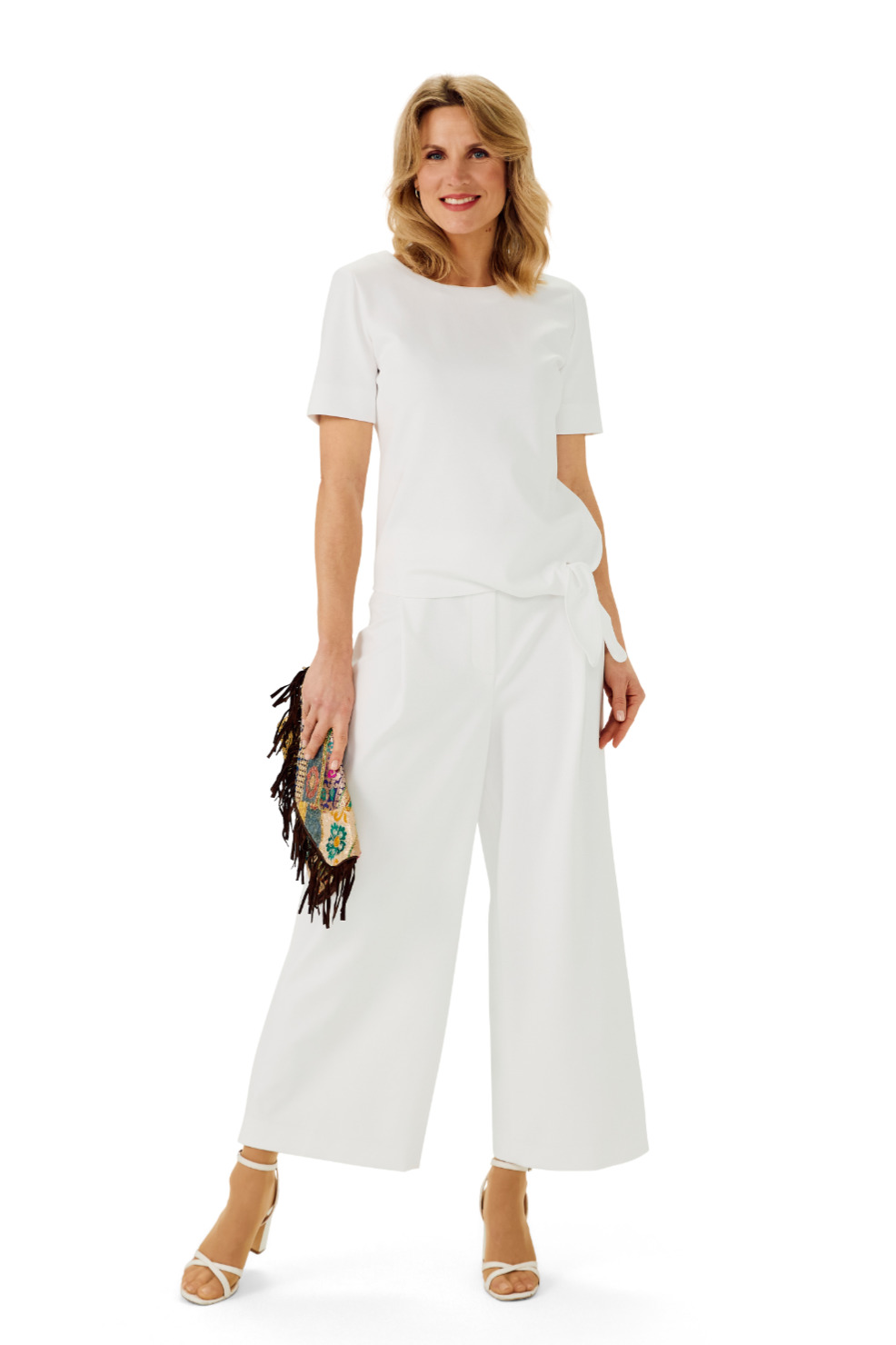 Hochsommerlicher City-Hosenanzug bestehend aus Bluse und Culotte aus weißem Romanit.