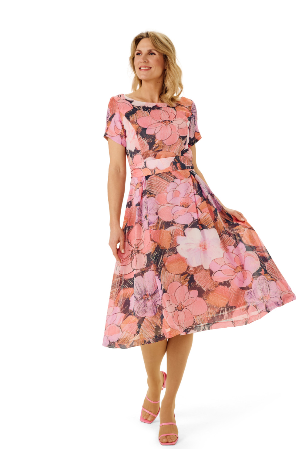 Luftiges Sommerkleid aus reiner Seide mit Taillengürtel, ausgestellt geschnitten, knielang mit schräg eingesetzten kurzen Ärmeln.